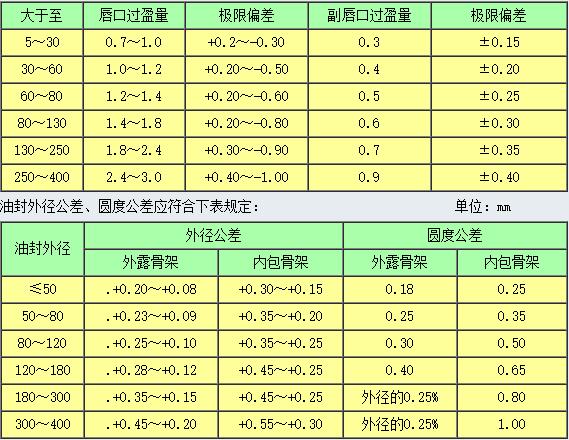 內(nèi)包骨架旋轉(zhuǎn)唇型密封圈唇口、副唇口過盈量和內(nèi)徑極限偏差 單位:mm
